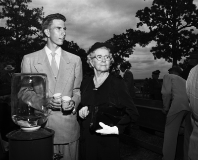 Weldon Cannon draws a glass of water for his great-aunt, Mrs. Tom Cannon, 79, one of the oldest women present at the 53rd annual Bedford old settler reunion.
