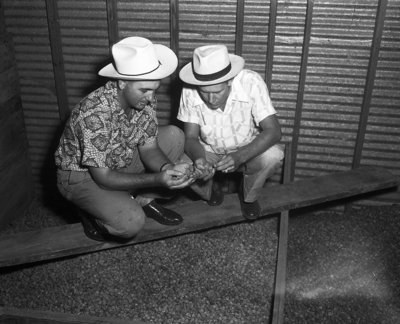 Beans that are ready to go to the hulling machine are inspected by L. D. Cox, left, and J. T. McKay, veterans vocational agriculture teachers of Comanche.