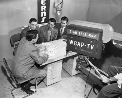 Fort Worth Cats President John Reeves (left), Manager Bobby Bragan (center) and Business Manager Wallace Jay face Bud Watson on WBAP-TV sports program. Bragan leaves for Florida and spring training.
