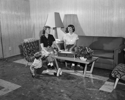 The playroom at the Bert K. Smith Junior home, 2005 Warner Road, is a gathering place for neighboring children of various ages. Sturdy furniture in a converted garage makes an ideal rumpus room. Here Lynne Kendall, left, a niece of the Smiths, and their two children, Tommy and Susan, have a moment before the crowd gathers.