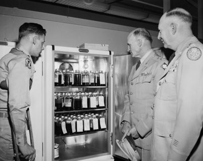 A supply of the greatest single life-saving medicine needed by the armed forces is viewed at the North Texas National Defense Blood Center by three dedication ceremony honor guests. Left to right are Private First Class Donald Bratthaur of Algonquin, Illinois, a Korean veteran; Major General Hobart R. Gay, deputy commanding general of the 4th Army, and Major General C. S. Irvine, commander of the 19th Air Division at Carswell Air Force Base. The three men are looking at jars of blood, being held in a fridge. Bratthaur is shown using crutches.