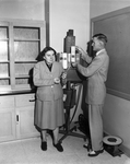 Dr. Pauline Beery Mack, dean of the college of household arts and sciences at TSCW, and Dr. George Sims Wham Junior, textiles research staff member, demonstrate use of the color-testing machine now in use at the college. The materials are exposed to an arc lamp simulating the sun's rays. In 48 hours it will determine the relative durability of fabrics for their entire lifetime.