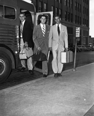 End Bill Schaake, Halfback Charley Hoag, and Defensive Back Aubrey Linville, left to right, unload equipment after Kansas University football team arrived in Fort Worth for game against TCU.