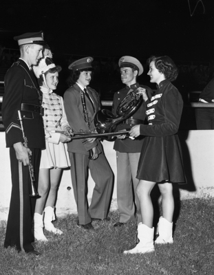 High school band members talk shop at the TCU-Kansas football game before putting on their show. The students, left to right, are Billy Farquhar, Nocona; Alletta Jo Ables, Granbury; Betty Shook, Hico; Shorty Kendrick, Eastland, and Ann Bush, De Leon.