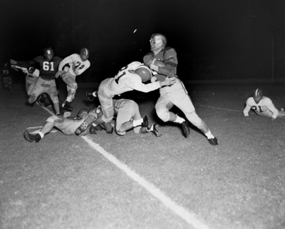 Charley Hoag, star Kansas halfback, is brought to a stop by Texas Christian's Charles Rogers after a three-yard gain in the game at Amon Carter Stadium. The play came in the first period. Published in Fort Worth Star-Telegram morning edition, September 23, 1951.
