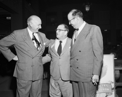 Three Texas members of the drilling fraternity on hand for the 11th annual meeting of the American Association of Oilwell Drilling Contractors. Left to right: J. E. Brantly, Abilene and Dallas; J. Ed Warren, Midland, president of the Independent Petroleum Association of America, and George P. Livermore, Lubbock. Published in the Fort Worth Star-Telegram evening edition, September 24, 1951.