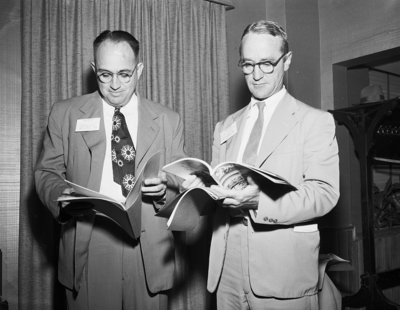 Looking over the AAOWDC's magazine, left to right, are: Field M. Davis, Field Drilling Company, San Antonio, and J. Greer Wilcox, Circle Drilling Company, Lake Charles, Louisiana. Published in the Fort Worth Star-Telegram evening edition, September 24, 1951.