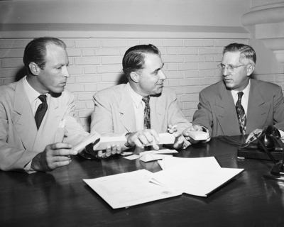 Planning the Giant Sales Rally are, left to right, Guy Rogers Junior, director of the Fort Worth Sales Executives Club, Theron Brooks, president of the club, and I. C. Parker, general rally chairman. Published in the Fort Worth Star-Telegram evening edition, September 25, 1951.