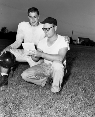 Tommy Runnels, North Side back ran and passed for 365 yards against Borger, gets some instruction from Coach Kenneth Gire about the night's game with Brownwood. Published in Fort Worth Star-Telegram morning edition, September 27, 1951.