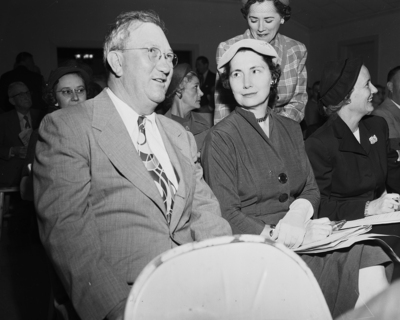 Arch Rowan of Fort Worth chats with Mrs. Bennett Smith, Tarrant County committeewoman, at the State Democratic Executive meeting at Snyder. Rowan was proxy for Neville Penrose, Tarrant County committeeman. There are more people shown sitting around and behind them.