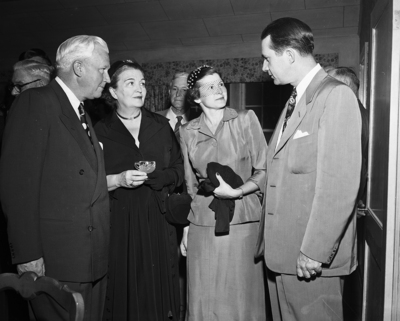 Governor Allan Shivers, right, pauses at reception for talk with National Committeeman Wright Morrow of Houston, Mrs. Morrow and Mrs. Bryan Bradbury of Abilene, second from right, committeewoman from the 24th District.