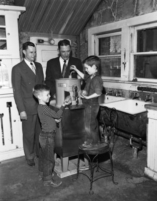 Tom Nunn, left, and J. H. Evans, of the Arlington Heights Lions Club, explain how to use the new potato peeler the club has given Lena Pope Home. Eager to feed potatoes to the machine are Randal Scott, 5, and Steve Foster, 4, standing by chair. Two boys playing with a tank or toy together. Two men looking at them. Published in Fort Worth Star-Telegram morning edition, February 28, 1950.