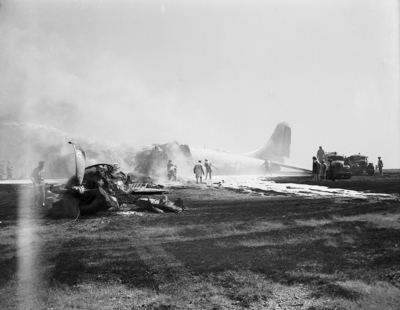 Firemen from Carswell Air Base and Convair poured a flood of chemical mixtures onto a B-29 superfort that blazed September 29th, 1951, after a crash at the base. Flames engulfed the bomber seconds after the plane skidded to a stop, but the five crewmen ferrying the B-29 from Pyote to Warner Robins Air Base, Georgia, escaped without aid from the wreckage. Published in the Fort Worth Star-Telegram morning edition, September 30, 1951.