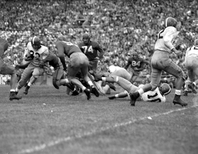 Texas Christian's Bobby Jack Floyd is brought to a stop after a one yard gain against Nebraska in the Frogs' final touchdown at Lincoln. Published in Fort Worth Star-Telegram morning edition, October 1, 1951.