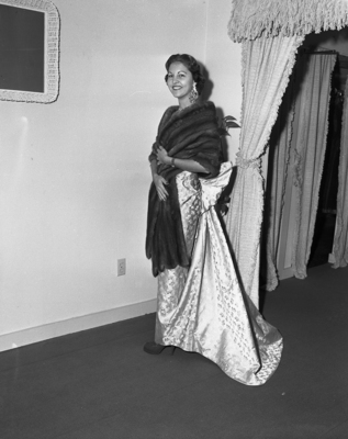 Miss Jean Waggoner's gown is a champagne brocade by "Foxy," made with a strapless bodice, butterfly bustle, and short train. The curved stole is a Koslow design of royal pastel mink.