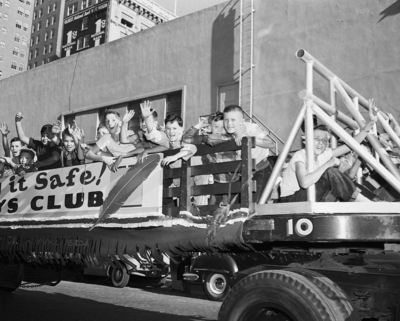 Members of Panther Boys Club, along with representatives of the other Red Feather organizations, herald the opening of the general Community Chest fund-raising campaign. The chest sponsored the parade to show Fort Worth what the Red Feather agencies do. Unidentified members of the Panther Boys Club shown riding on truck in parade. Published in the Fort Worth Star-Telegram morning edition, October 3, 1951.