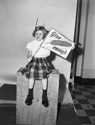 Mary Rose Etta McClure, 7-year-old resident of All Church Home, a Red Feather agency, was to lead the chest agencies' display as Red Feather Girl in the Community Chest parade. The parade precedes the kickoff of the chest's campaign proper to raise $666,408.96, much of which goes to children. Mary is sitting on a wooden block, and holding a flag that reads, "Give enough." Published in the Fort Worth Star-Telegram evening edition, October 2, 1951.