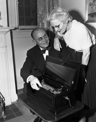 Reverend Erwin F. Bohmfalk, pastor of Central Methodist Church, and Mrs. Bohmfalk are shown examining the Swiss music box purchased at Oxford, England, where they attended the Ecumenical Methodist Conference after a tour of the Continent.