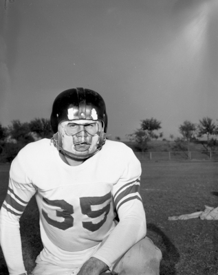 John Keeton of Arlington Heights is shown wearing his uniform and a football helmet with a faceguard. Published in Fort Worth Star-Telegram evening edition, October 10, 1951.