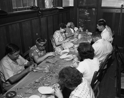 The Lighthouse for the Blind is a Community Chest agency for the training and employment of the sightless. At the Lighthouse sensitive busy fingers fly over each profitable task. Shown here is a group of workers lacing moccasins that brought profits for all. To make the Lighthouse possible for another year, the Community Chest asked for $9,454.96. This image was included during the Star-Telegram's observation of the "National Employ the Physically Handicapped Week" in October.
