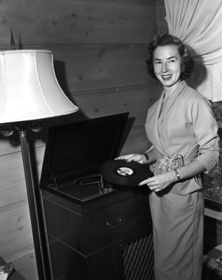 Portrait of Miss Frances Hackney holding a record by a record player.
