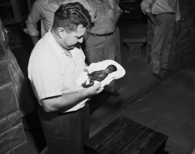 Forest Park Zoo Director Hamilton Hittson, holds a baby chimpanzee born to Harriet and Al, proud parents of zoo colony.