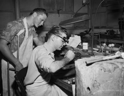 Robert Green, left, and Jack Renner, both of whom are amputees, are doing jobs which have won praise from their superiors at Haltom's jewelry factory. This image was included during the Star-Telegram's observation of the "National Employ the Physically Handicapped Week" in October.