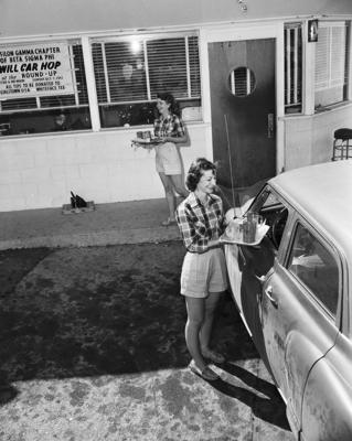 Members of Beta Sigma Phi, business girls' organization, made $90.19 in their car-hopping project at the Round-Up, 23rd at N. Main. Proceeds will go to the support of Girlstown, USA, in Whiteface. Demonstrating the profitable technique are Miss NaRay McHood at the auto, and Mrs. Mary F. Martin behind her.