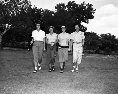 Image shows some of the entries in the Texas Women's Open Golf Tournament at River Crest, shown left to right, are Pat Garner of Midland; Barbara Romack, of Sacramento, California; Francis Rich, of Bainbridge Georgia; and Mrs. Frank Goldthwaite, of Fort Worth, Texas. Published in the evening edition, October 8, 1951.