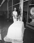 V. L. Turgason is inventor of Cloverbloom 99, the new spread of the Amour margarine division. In photo is D. L. McLemore, print room foreman at the plant, pulls a dolly-load of the product. Published in Fort Worth Star-Telegram morning edition, March 5, 1950.