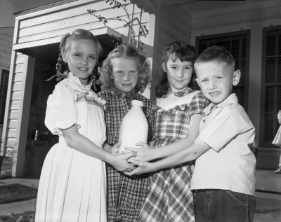 These four children and their friends, who have plenty of milk to drink, wanted others less fortunate to have some too. They gave a play for the Star-Telegram Milk and Ice Fund. Lending a big hand were left to right, Patricia Ann Dollins, 3321 Purington; Mary Eleene Rogers, 2800 Bomar; Judith Marie Davis, 3321 Meadowbrook, and Johnny Hopkins, 3325 Purington. Published in Fort Worth Star-Telegram evening edition, March 2, 1950.