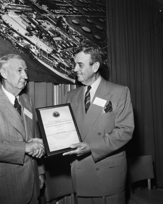 J. A. Neath, left, vice president and director of Humble Oil & Refining Company, Houston, receives from W. A. Moncrief, Fort Worth, a distinguished service award as the outstanding oil man of the year among major company ranks.