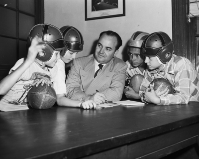 Whether it's football, club government or just everyday sports and fun, boys of the YMCA have a say-so in the planning. Football players Robert Grayson, Ricky Abbott, Pete Pulido and John David Richardson, left to right, plan activities with Charlie Coln, center, volunteer West Side YMCA leader.