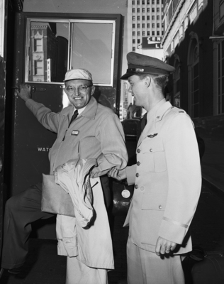 Robbie Robinson, staff cartoonist for the Indianapolis News and creator of the afternoon Star-Telegram comic panel "Josephine," is shown entering an Air Force bus at Hotel Texas for a tour of Carswell Air Force Base. 1st Lieutenant Leonard E. B. Andrews, base public information officer and tour conductor for the 30 visiting cartoonists, is with him. Inset is Robinson's "Josephine".