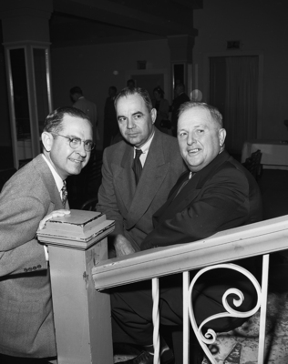 Three speakers at a housing forum are shown in a preliminary huddle before the meeting. Left to right, W. W. Caruth Jr. of Dallas; Ed Gossett, Dallas attorney and former congressman, and Joe Driskell of Fort Worth.
