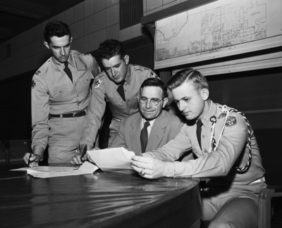 A Texas A&M delegation mapped plans with city officials for the corps parade before the TCU-A&M football game at Fort Worth. Planning parade procedure are, left to right, Buddy Burch, band commander; Bill Turner, operations officer; S. J. Baker president of the Fort Worth A&M Club, and Eric Carlson, cadet colonel of the corps.