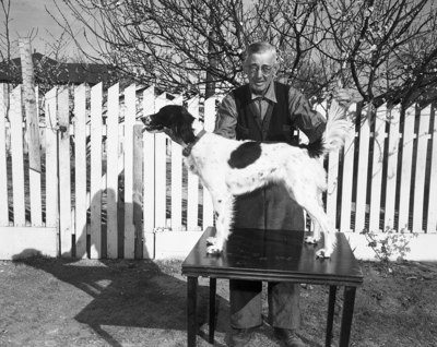 Eagle Mountain Betsy, white and black setter, appears to her owner, Ward C. Alcorn, to be ready for the bench show at the Fort Worth Pointer and Setter Club.
