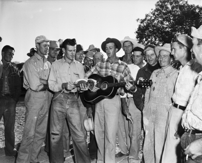 City garbage workers on strike sang hymns as they waited outside the fence at city garage. Leading the singing were C. L. Hatcher, song book in hand, and Hardy Fuller, guitar player, who also doubled as a hillbilly singers for the entertainment of the strikers.