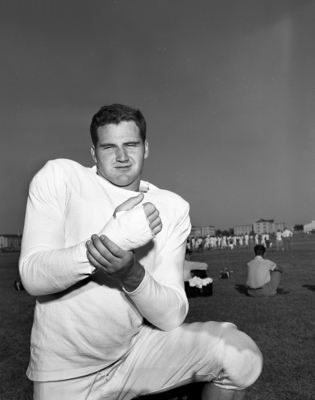 Texas Christian University's fullback Bobby Jack Floyd exhibits cast on broken hand, which will probably keep him out of Texas Tech game. Published in Fort Worth Star-Telegram evening edition, October 12, 1951.