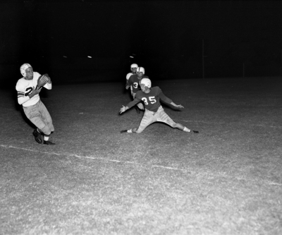 Elton Strother, Diamond Hill's end, tries in vain to hold onto an Eastland pass that had gone astray in the game night at Farrington Field. Published in Fort Worth Star-Telegram morning edition, October 12, 1951.