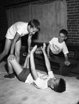 Practicing on tumbling acts for programs are three members of the Fort Worth Boy's Club. Lying on the mat is Jeff Ramsdell, 11, son of Mr. and Mrs. L. T. Ramsdell, 1418 N. Houston. His pardner is Marlen Woods, 13, son of Mr. and Mrs. Paul Hammond, 2115 Gould. Watching on the sidelines is Don Dagnell, 12, son of Mr. and Mrs. Roy R. Dagnell, 2712 Azle.