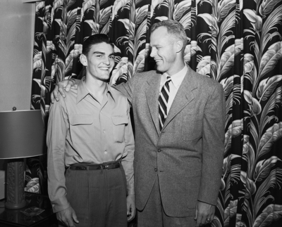 Jack Van Pool, University of Oklahoma player, left, and Coach Charles Wilkinson in formal suit and tie pictured while putting hand on the shoulder of Jack Pool.