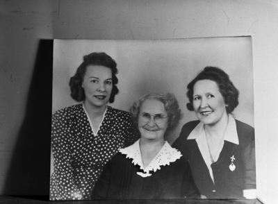 Copy of photo of Mrs. Laura Franklin sitting in the center in a dress. Two unidentified women sit on either side of her.