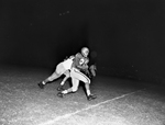 Bobby Cavazos, Texas Tech back, scampers along toward a 10 yard gain against Texas Christian University after taking a pass in the game at Lubbock. Coming up is Ronald Fraley, Texas Christian University, to make the tackle on the Frog 45 yard line. Published in Fort Worth Star-Telegram morning edition, October 14, 1951.