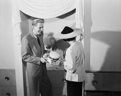 The customer can't decide which hat to buy, but she has the able assistance of Keneth Hopkins, California milliner, in making a selection. Hopkins will be at The Fair to show his spring hat collection.