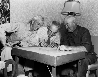 Robert N. Thomas, center, signs a pledge to his brothers, Charles, left, and Zack, that he'll write them when he returns to California. Charles and Zack hadn't seen or heard from Robert since 1924 until he dropped in on them this week.