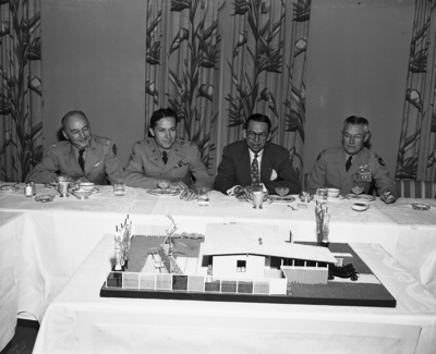 Scale model of a two-bedroom cottage was displayed at a luncheon meeting in Fort Worth Club, when preliminary plans for a 1,000 unit project at Wolters Air Force Base were discussed. left to right, Colonel Albert J. Wehrell, Colonel H. R. Hallock, Charles E. Armstrong, and Colonel Edgar E. Glenn.
