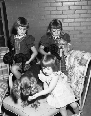 Mary Lou, Christiana and George Ann, all of daughters of Mrs. Harold K. Johnson. Shown with their cocker "Roxie".