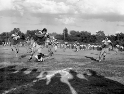 Robert Lay of Daggett evades unidentified Rosemont tackler, goes for 17 yards in game. Published in Fort Worth Star-Telegram morning edition, October 18, 1951.
