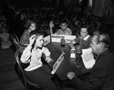 Tom McCann, Lee Ann Campbell, Sherwin Goldman, Deborah Chamberlain, and Porter Randall, participating in radio program.